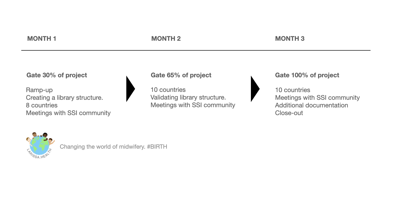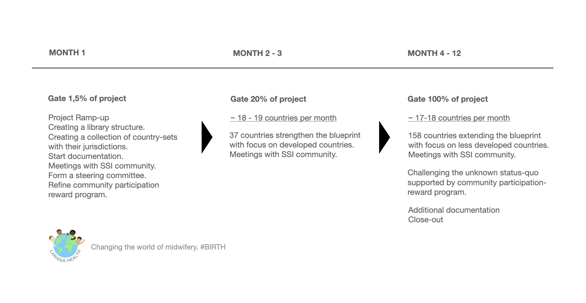 Creating a library structure. Creating a collection of country sets with their jurisdictions. Start documentation. Meetings with SSI community. Form a steering committee. Refine community participation program. 2 waves in 2 months. Implementing ~18- 19 countries per month. 37 countries to strengthen the blueprint with focus on developed countries. Meetings with SSI community. 8 waves in 8 months. Implementing ~17- 18 countries per month. 158 countries extending the blueprint with focus on less developed countries. 37 countries to strengthen the blueprint with focus on developed countries. Meetings with SSI community. Challenging the unknown status-quo supported by community participation- reward program. Additional documentation. F10 Close-out report.Ramp-up
